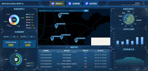 国家应急安全装备云管理平台集设备分布、装备统计、视频集成于一体,做到全局把控、设备监测、全生命周期综合使用可视化操作。当遇到突发事件时,能在线直观的分析并高效的了解到设备实时状态。 国家应急安全装备云管理平台通过与服务器后台平台进行信息传输,实现线上查看设备信息的操作、浏览和统计。工作人员可以通过国家应急安全装备云管理平台了解各个设备的基本信息,掌握现场设备设备的工作状态、运行情况、监测气体、视频、电量情况等信息,从而快速实现了装备与人、装备与云、人与云互通互信的过程,同时解决了以前对设备信息不了解、现场情况无法实时查看、效率低、难题。在提高工作效率的同时增加了物联网的准确性和先进性,解决了以往信息传递难、无电子版信息储存、无统计分析等问题。 | |