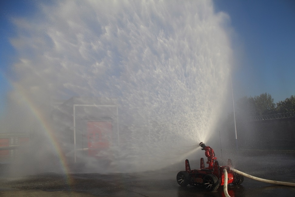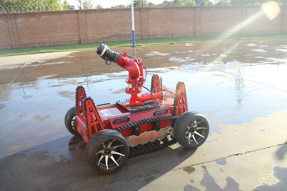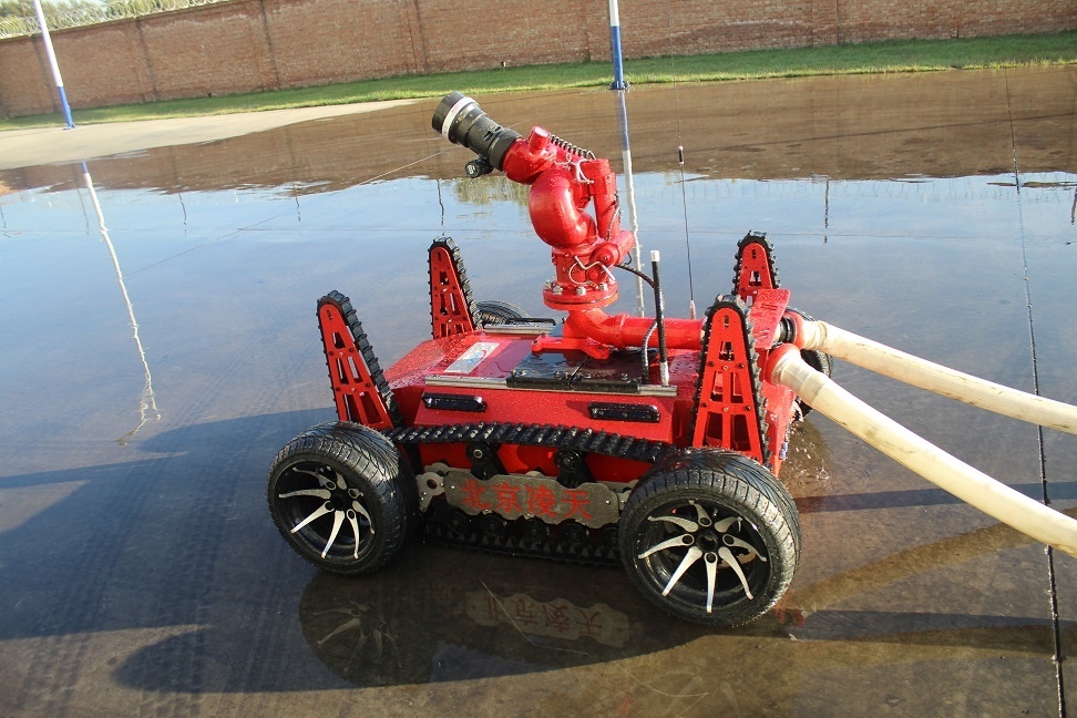 消防灭火机器人采用履带+摆臂+轮式的底盘设计,能够适应救援环境中各种复杂地面。装配环境检测装置,在灭火的同时对现场环境数据进行侦测。消防灭火侦查机器人由机器人主体,消防炮,环境检测装置,遥控箱四部分组成。主要作用是代替消防队员进入易燃易爆、有毒、缺氧、浓烟等危险灾害事故现场实施有效的灭火救援、化学检测和火场侦察。