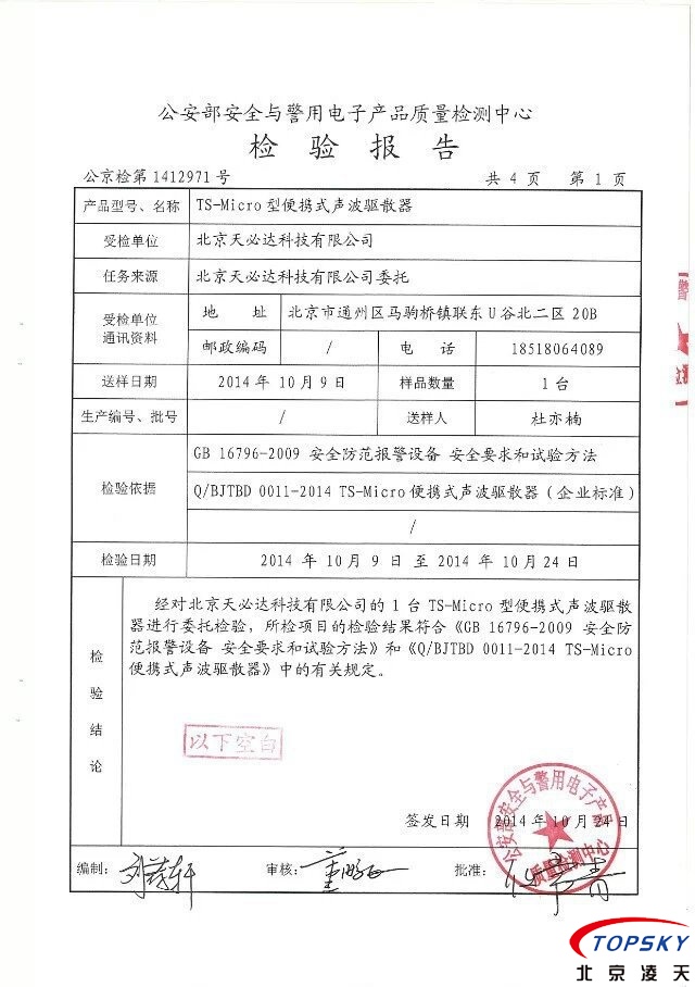 TS-Micro便携式噪声驱散器通过公安部权威机构检验