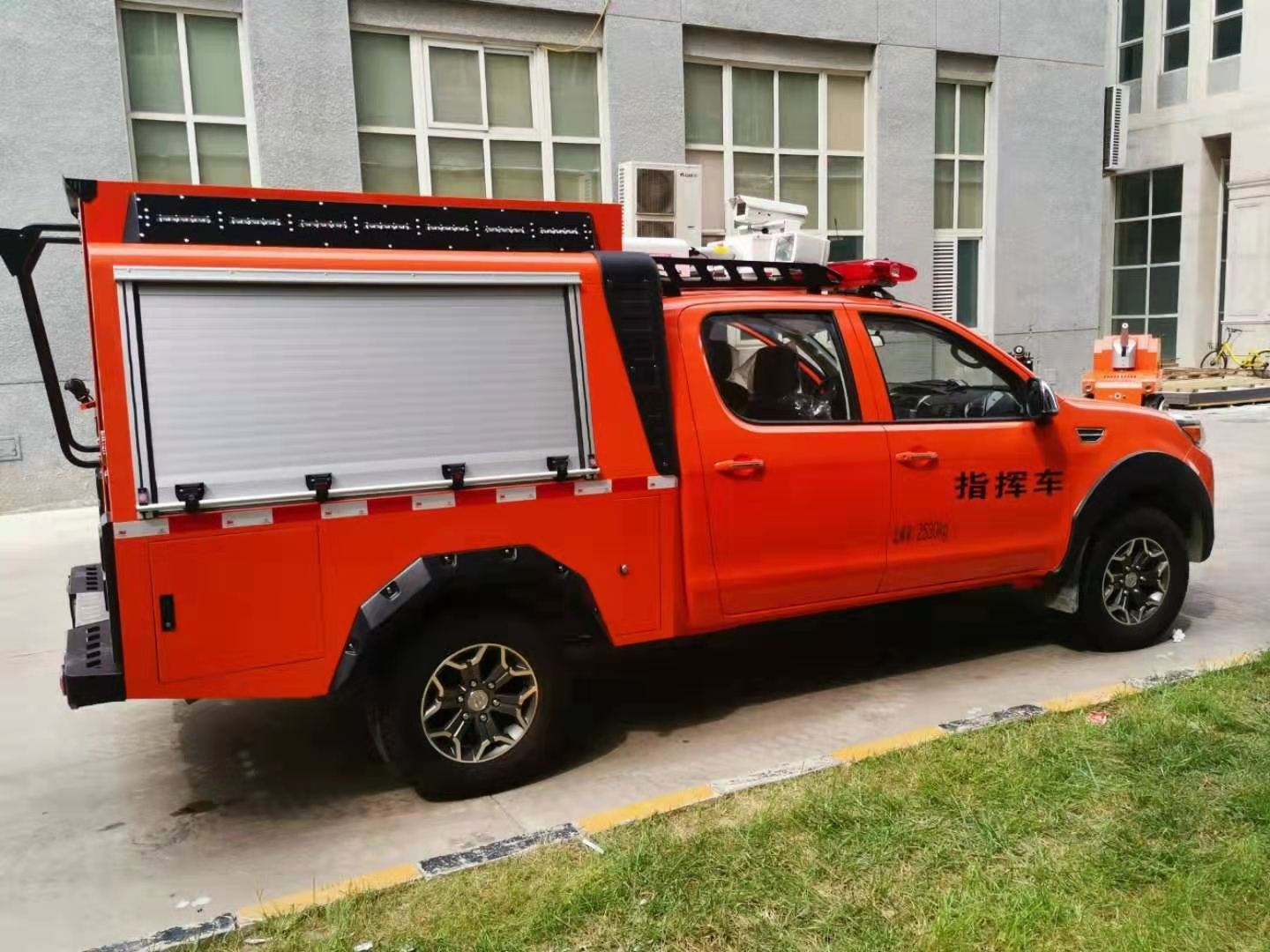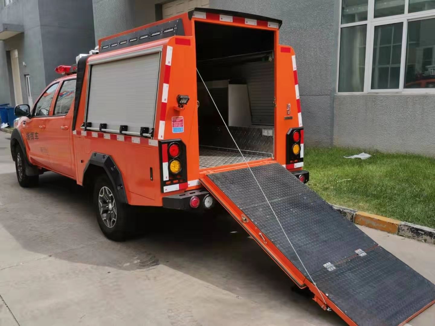 专门为特种机器人量身定做的一款机器人运输车,由皮卡车改装,区别于传统意义上大型运输车,体积更小,动力更足。车厢设计有升降照明系统,解决了救援现场能见度低的问题,1.2-1.8米升降高度,可满足不同照明需求。车体顶部装有4G图像传输系统,可将现场情况实时传输到指挥部,有利于指挥现场调度。配有一体化机器人装运梯,最大承压≥600Kg。后箱四周配有一圈小型照明系统,可用于晚间或光线昏暗等环境。后箱设计有独立储物架,可放置机器人配套设备。两侧卷闸窗设计方便拿用。