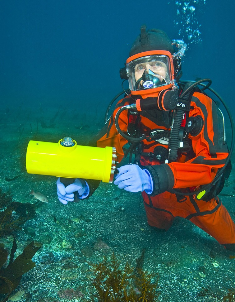 手持声纳设备为便携式、组合式的声纳系统,由声呐发射器和声呐接收器两部分组成,可实现发射和接收的操作。声呐发射器可为潜水员在水下定位水下物体。工作深度100m,顶部带有指南针,方便在水下辨别方向, 整体为醒目的亮黄色,接收器带有枪式握把,潜水员可单手操作接收器。