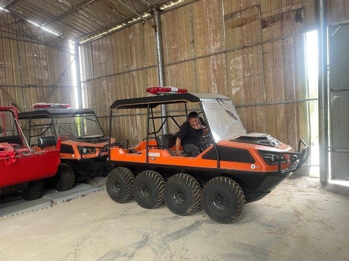 在复杂恶劣的地形条件和自然环境下,水陆两栖全地形车可以让搜救队员和携带的救援装备快速到达救援现场,减少徒步带来提供消耗,完成最后一公里最好五分钟紧急救援任务。水陆两栖全地形车可配备点到绞盘、救援担架组件、探照灯、警示灯、警报器、脱钩、破拆工具等装备, 给救援团队提供救援保障,更安全的解救伤员和疏散群众。