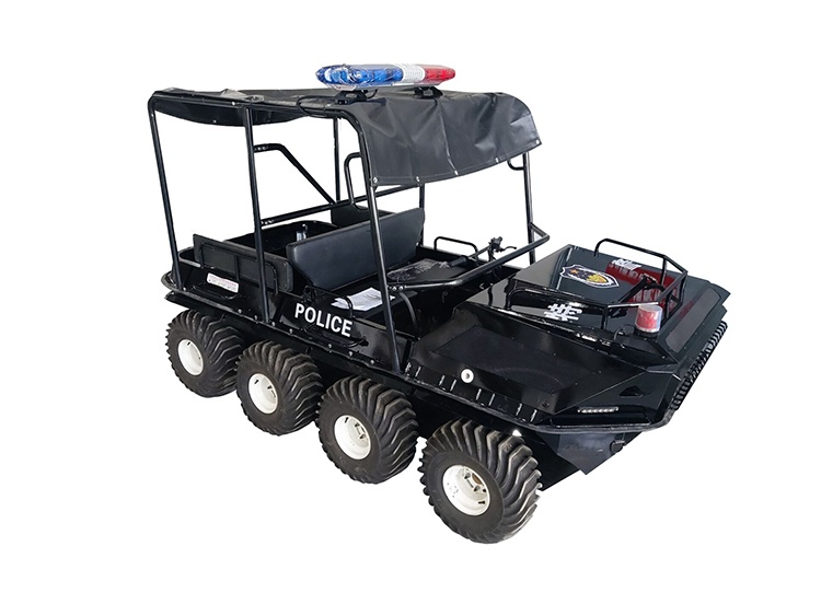 以完成可靠的野外应急救援为目的,该水陆两栖全地形车可提供一种安全的运输方式和可靠的运载平台,产品可以在山地环境、湿地环境、沼泽环境、水面环境、丛林环境等多种工作环境下,实现全天候连续作业。并且可以在灾害现场巡逻勘察、运送受伤人员、并有效实施援救。