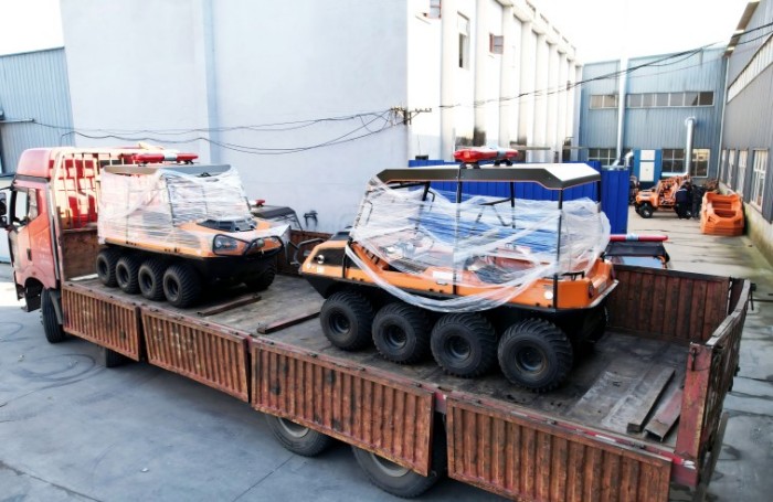 针对水灾频发的地区,水域救援任务必不可少。但往往洪涝灾害、城市内涝往往伴随着恶劣的天气和崎岖的地形,冲锋舟需要多次搭载不同交通工具并数次转移,水陆两栖全地形车可以轻松通过水淹、泥泞、沼泽等环境,无需人力搬运,实现陆地驾驶和水中行走自由切换,以最快的时效抵达现场实施救援。
