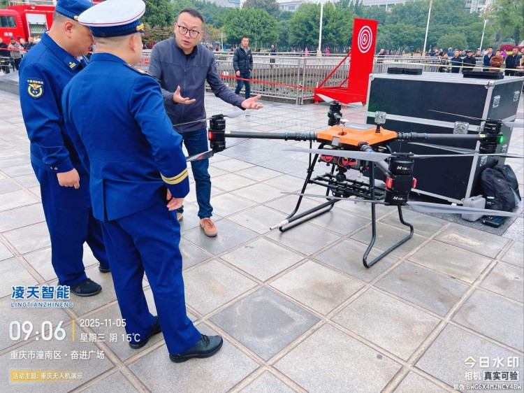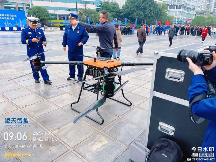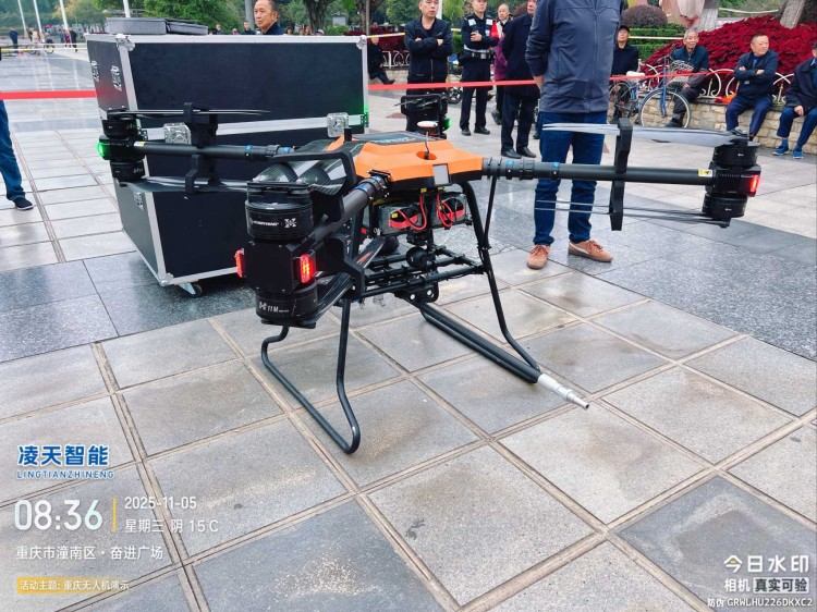 本无人机为北京凌天智能装备集团研发的陆空两栖三维侦测建模无人机,采用四旋翼机身设计,载重大,续航长,并且机体折叠标准化负载接口。同时,该无人机具备陆空两栖功能,可以在地面行驶。